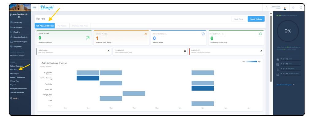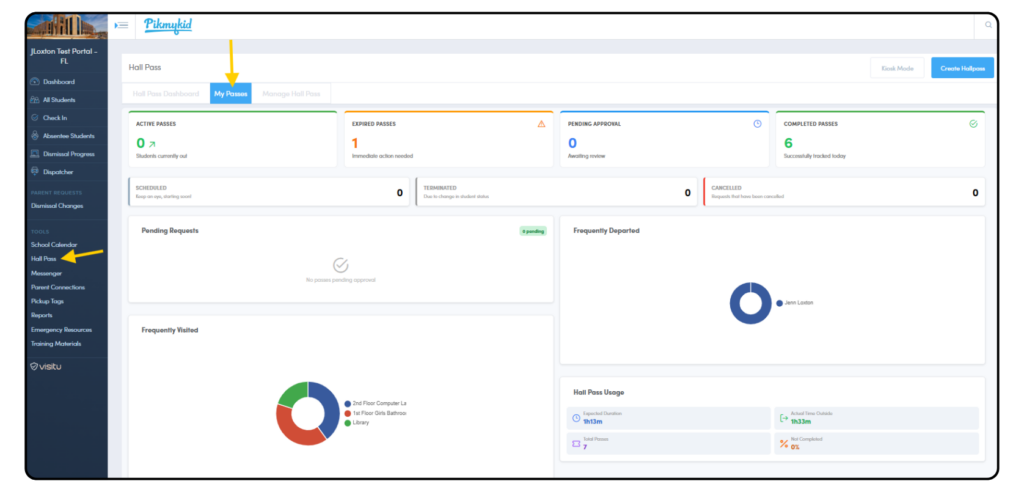 All school users will login to schools.pikmykid.com to access the school portal. From there, staff will navigate to the Hall Pass tab on the blue left side bar on the dashboard. A quick snapshot of Hall Pass activity can also be viewed from the portal dashboard.