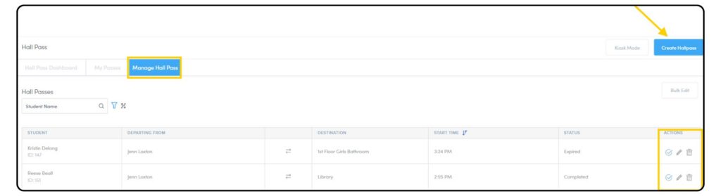 Manage Hall Passes provides a detailed view of all hall passes. You can sort and organize passes using a variety of filters. From this page, staff can create, edit, and complete passes.